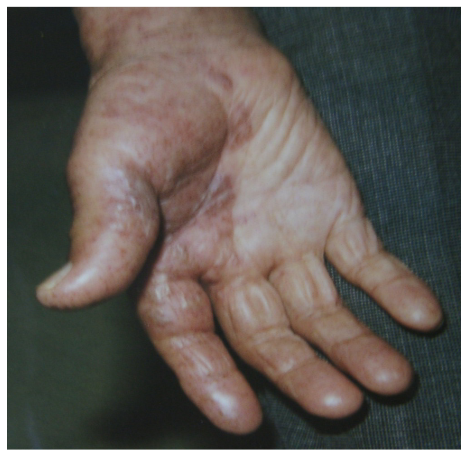 調子に乗って神経ブロックをガンガンしていたある日,ひとりの老紳士が外来に現れた.Sさんというその紳士は,夏だと言うのに(日田市の夏は暑い.当時まだあった水銀の体温計で測れた)ビシッとスーツを来て診察室の椅子に背筋を伸ばして座って,「腕が痛い」と言われた.出してもらった彼の左腕を見てびっくり.帯状疱疹がまだ生々しくびっしりと手のひらまでできていた(写真1).聞けば2週間ほど前に腕にぶつぶつができ,あっという間に広がって,近くの医者に診てもらったが痛みが全然取れない.痛くて眠られないとのこと.
